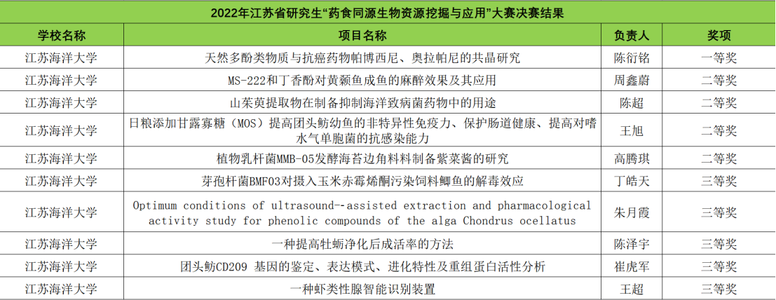 814日,2022年江苏省研究生“药食同源生物资源挖掘与应用”科研创新实践大赛获奖名单揭晓。江苏省研究生“药食同源生物资源挖掘与应用”科研创新实践大赛是由江苏省研究生教指委主办,江苏师范大学承办的研究生高级别学科竞赛,具有广泛的影响力。本次竞赛,共吸引中国药科大学、苏州大学、南京师范大学、江苏海洋大学等12所高校的51支研究生队伍参加。